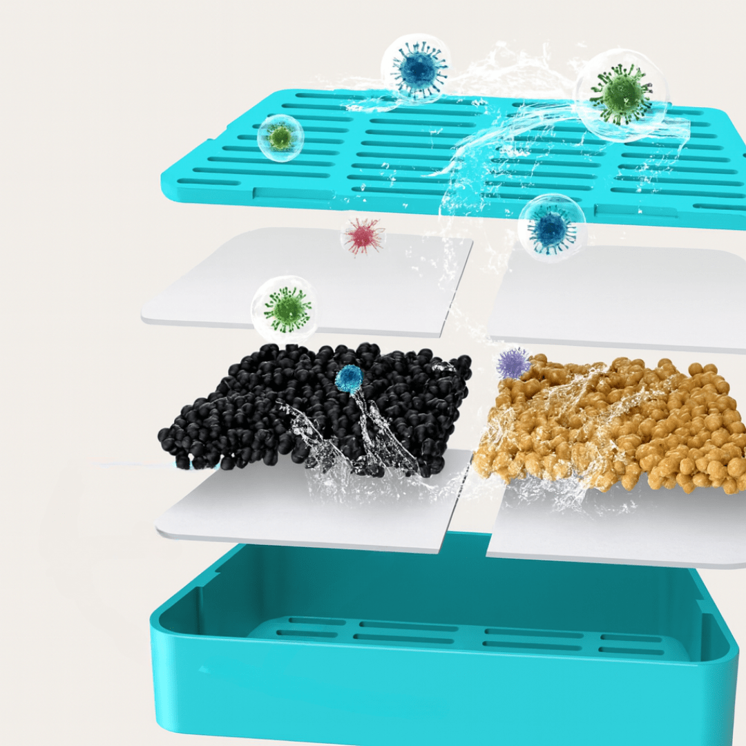 Het drielaagse filtersysteem in deze oplaadbare kattenfontein zorgt voor schoon en fris water. De combinatie van sponsfilters en actieve kool verwijdert effectief haren, stof en ongewenste geurtjes, waardoor uw kat altijd toegang heeft tot gezond drinkwater.