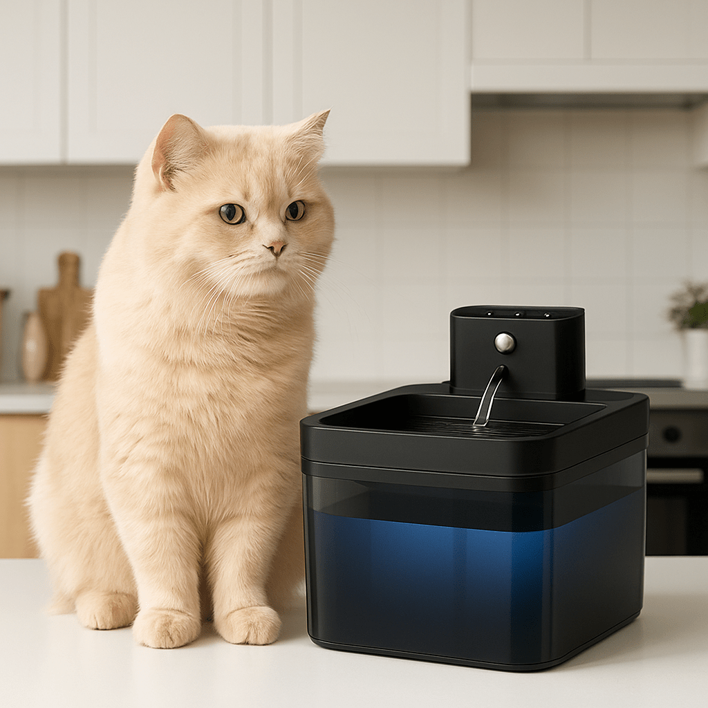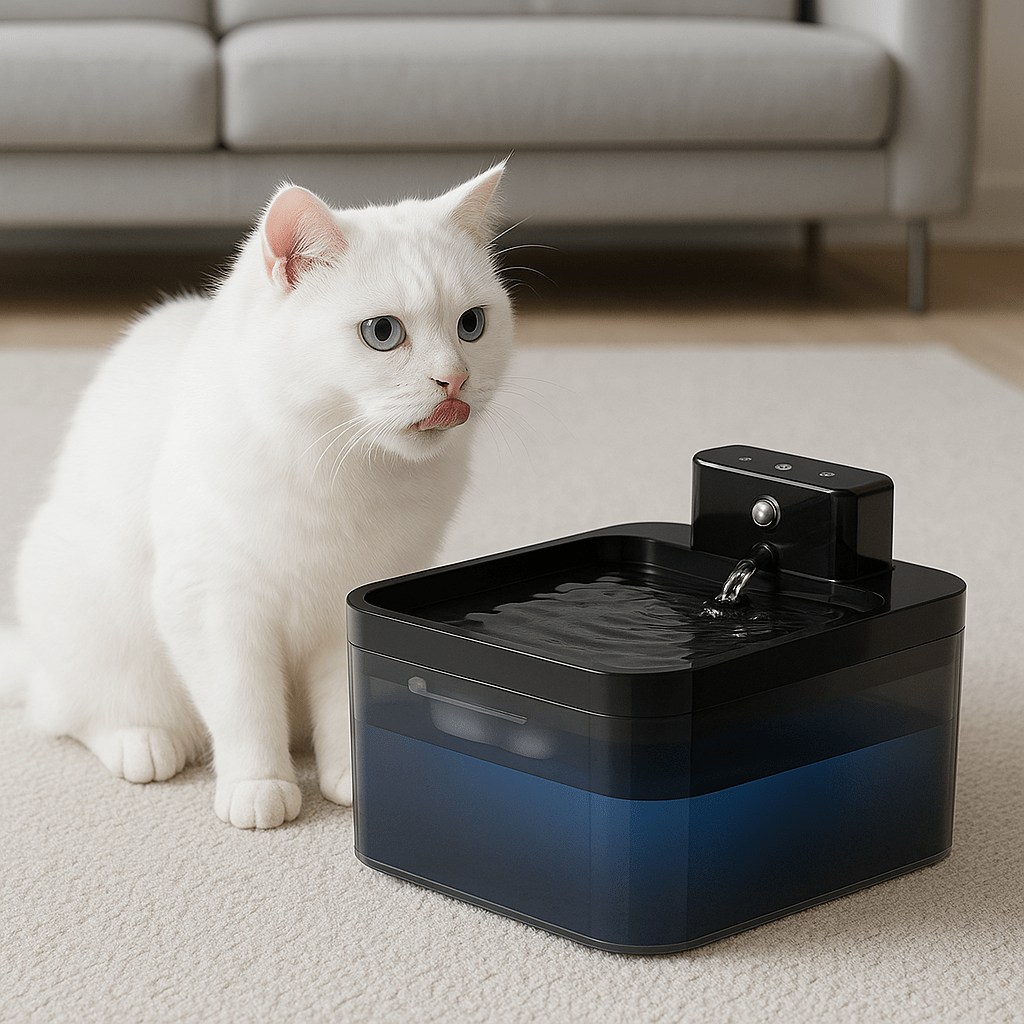 Met een geluidsniveau onder 25dB is deze stille drinkfontein voor katten ideaal voor gebruik dag en nacht. Het lage ontwerp ondersteunt een natuurlijke drinkhouding die de rug en nek van uw kat beschermt, terwijl het zachte blauwe licht zorgt voor zichtbaarheid in het donker.