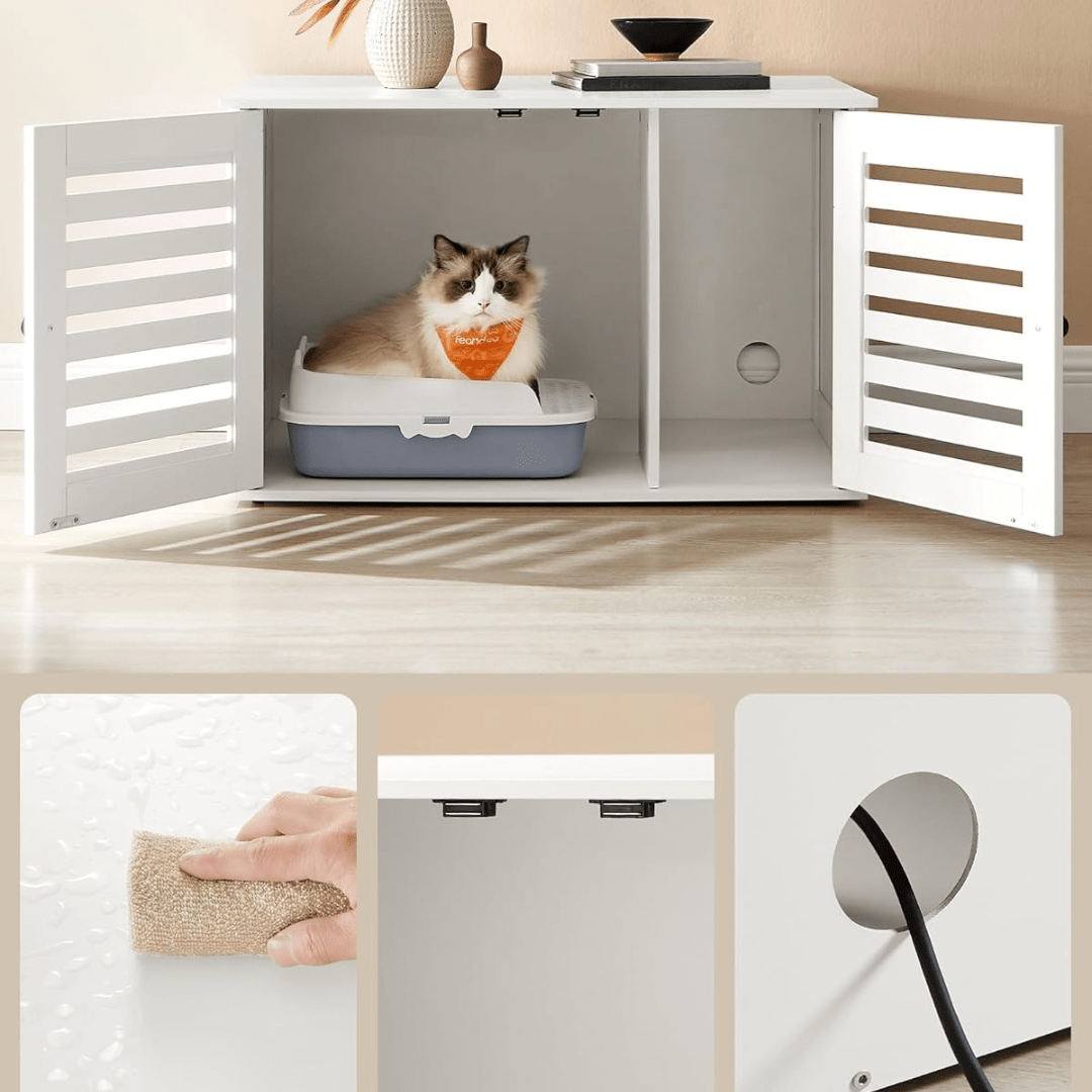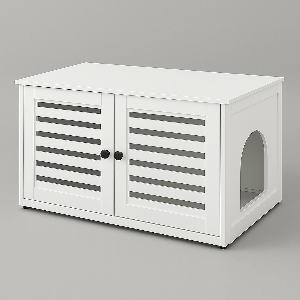 De lamellenvormige deuren van dit kattenbak kastje zorgen voor optimale luchtcirculatie zonder dat de inhoud zichtbaar is. Deze slimme constructie voorkomt onaangename geurtjes terwijl het kattentoilet meubel er stijlvol uitziet. Het gladde oppervlak is bovendien eenvoudig schoon te maken met een vochtige doek.