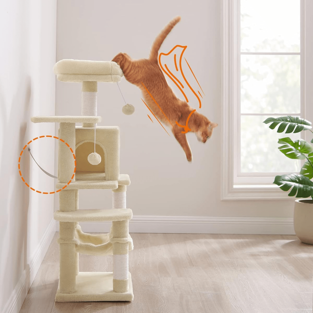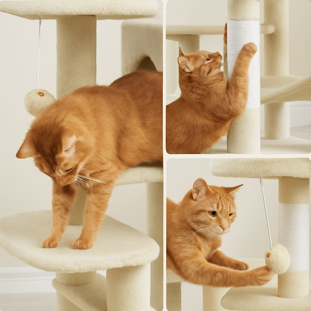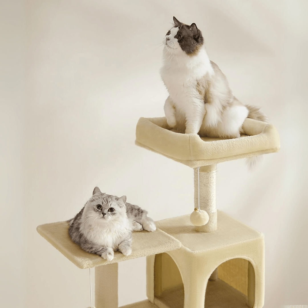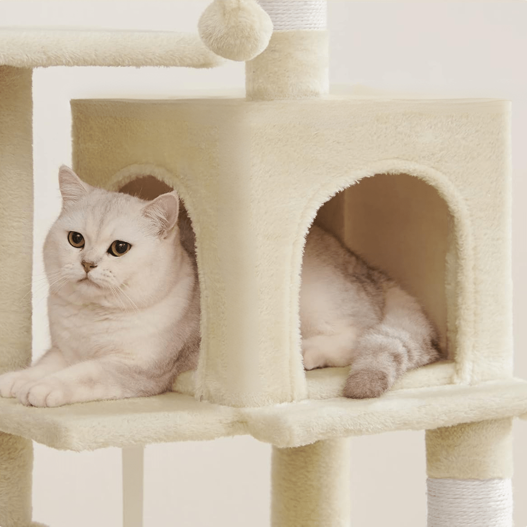 Deze beige kattenkrabpaal heeft een versterkte bodemplaat en extra kantelbeveiliging voor optimale stabiliteit. Het robuuste ontwerp ondersteunt zelfs twee katten tot 5 kg per stuk, waardoor meerdere huisdieren tegelijk kunnen spelen en rusten.