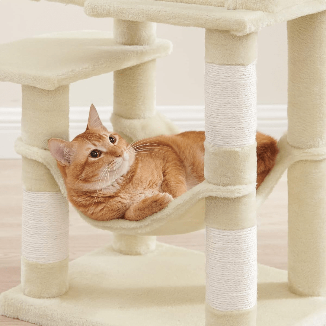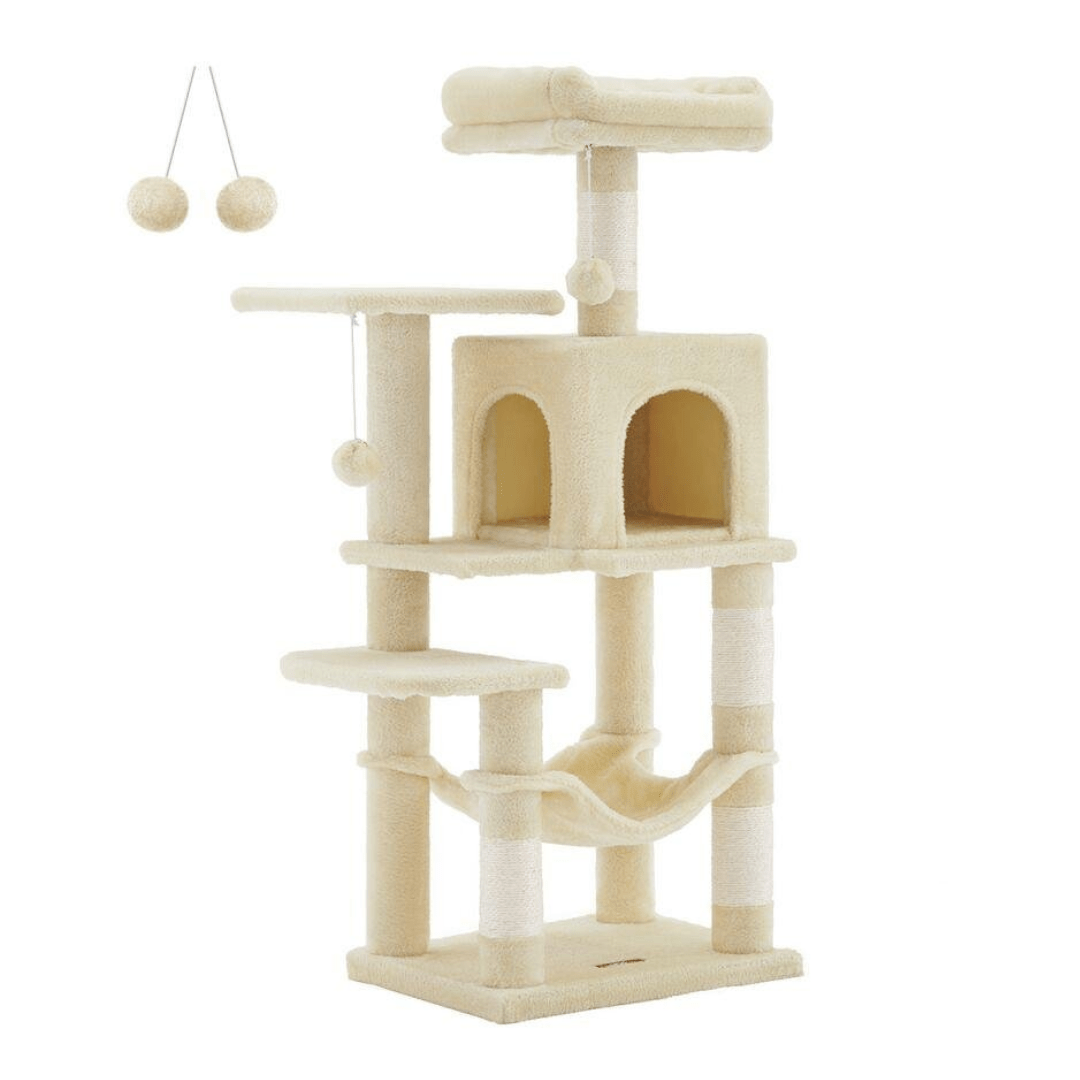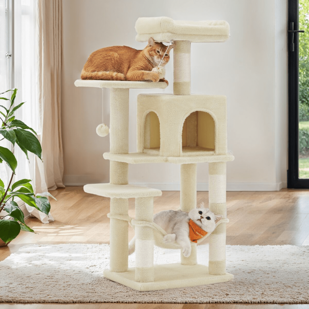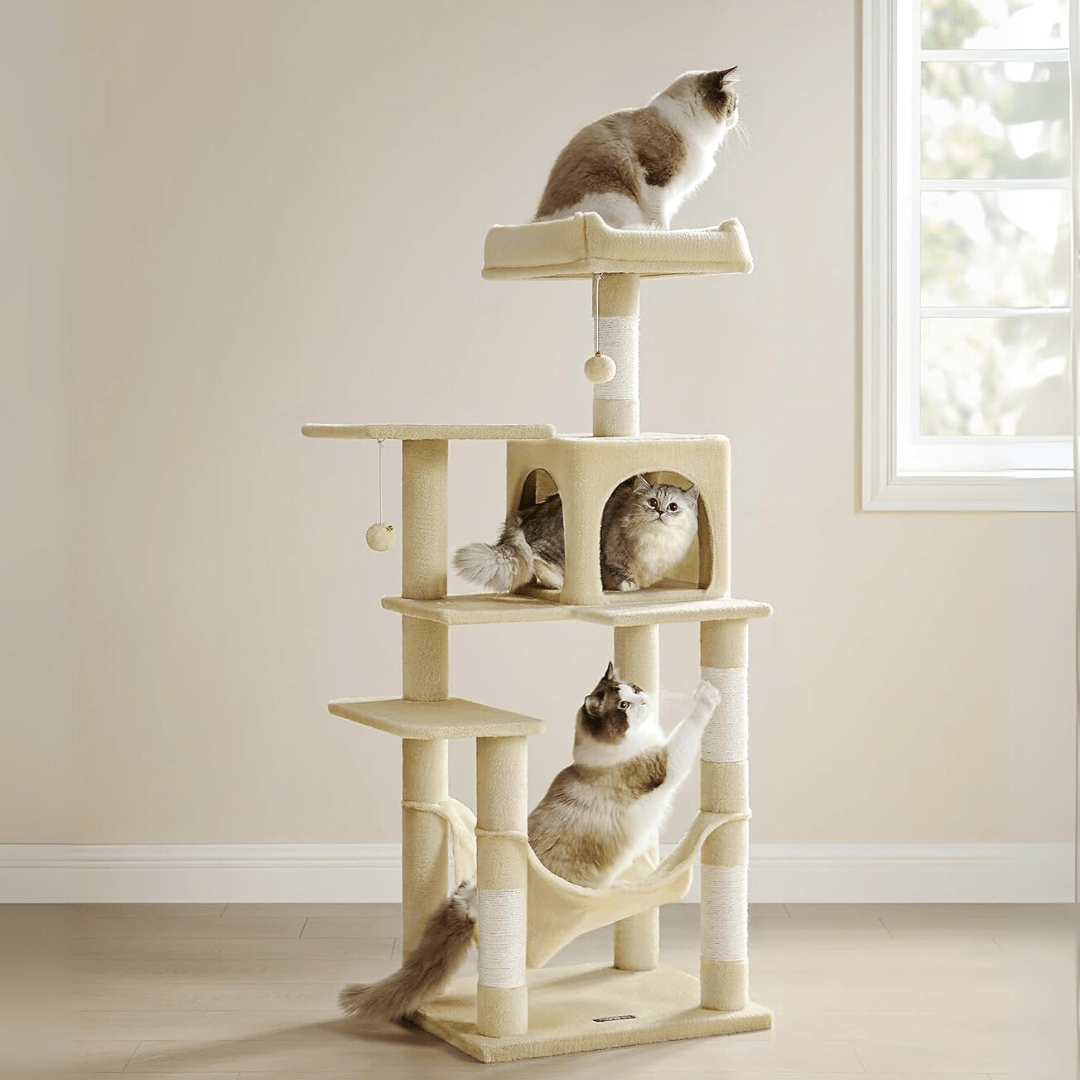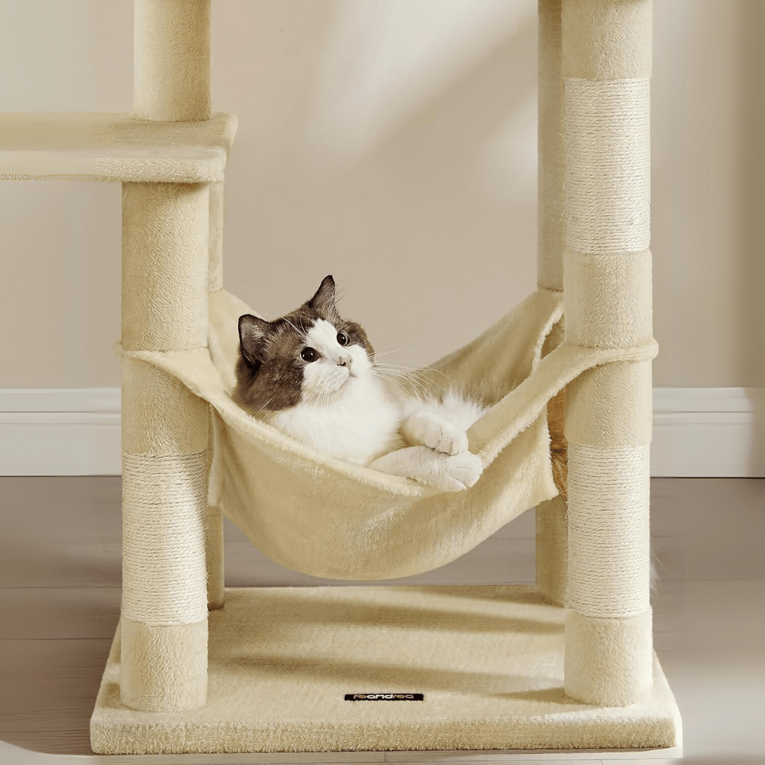 De krabpaal beige is een multifunctioneel kattenmeubel dat voorziet in alle natuurlijke behoeften van uw kat. Dit 143 cm hoge speelparadijs biedt vijf verschillende niveaus met een zachte hangmat, gezellig holletje en meerdere krabpalen bekleed met sisal. Perfect voor binnenkatten die behoefte hebben aan beweging, rust en entertainment. De beige krabpaal combineert functionaliteit met een neutrale kleur die in elk interieur past.