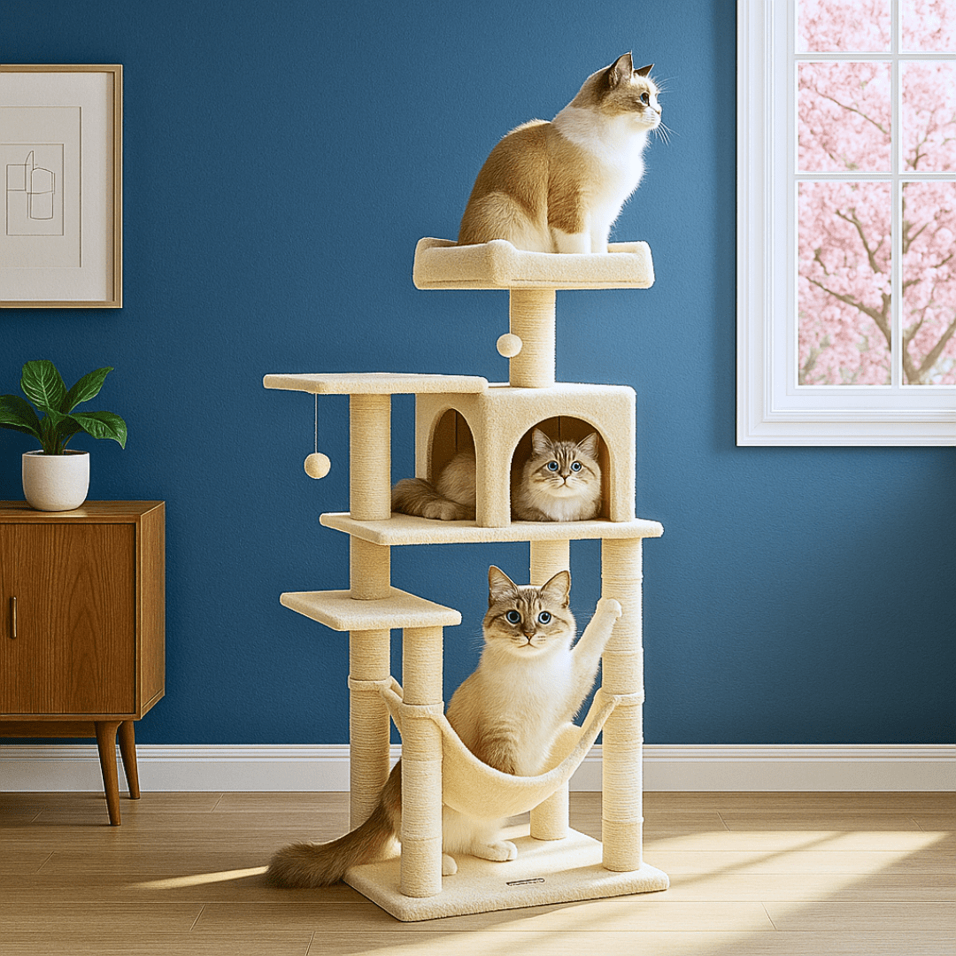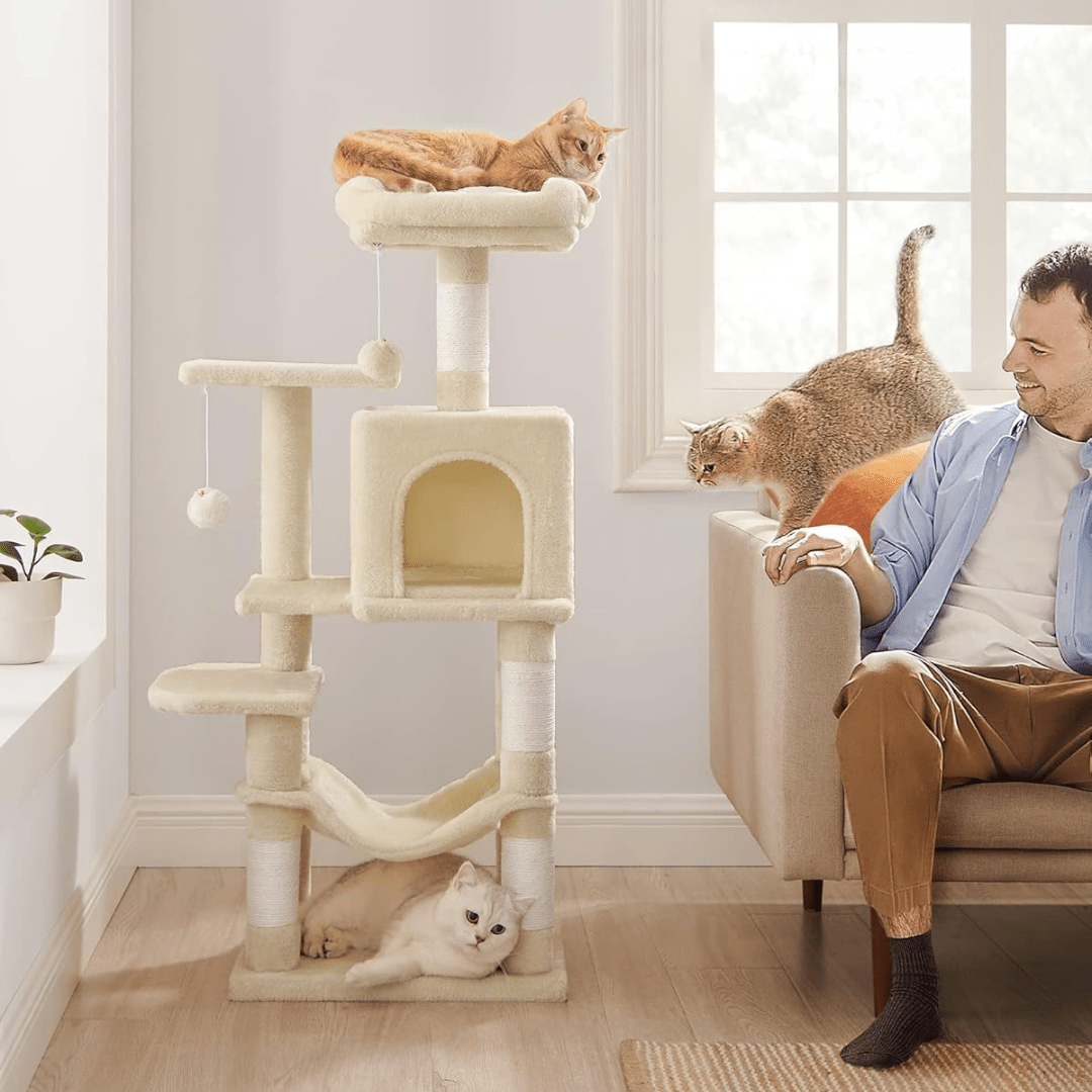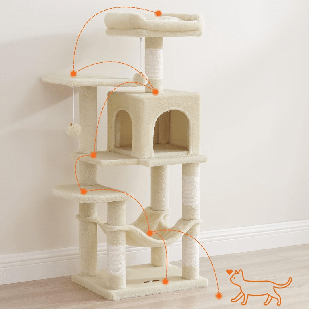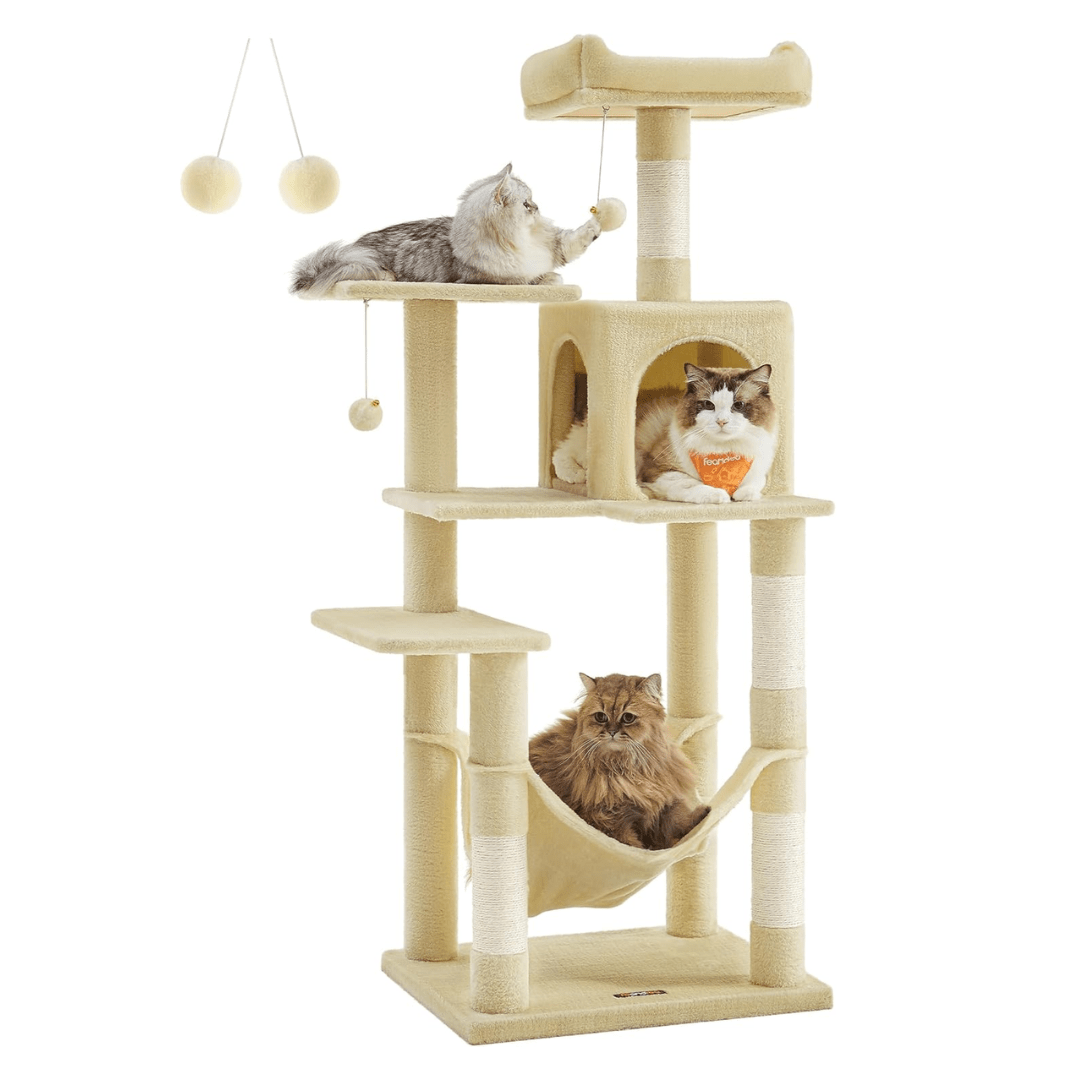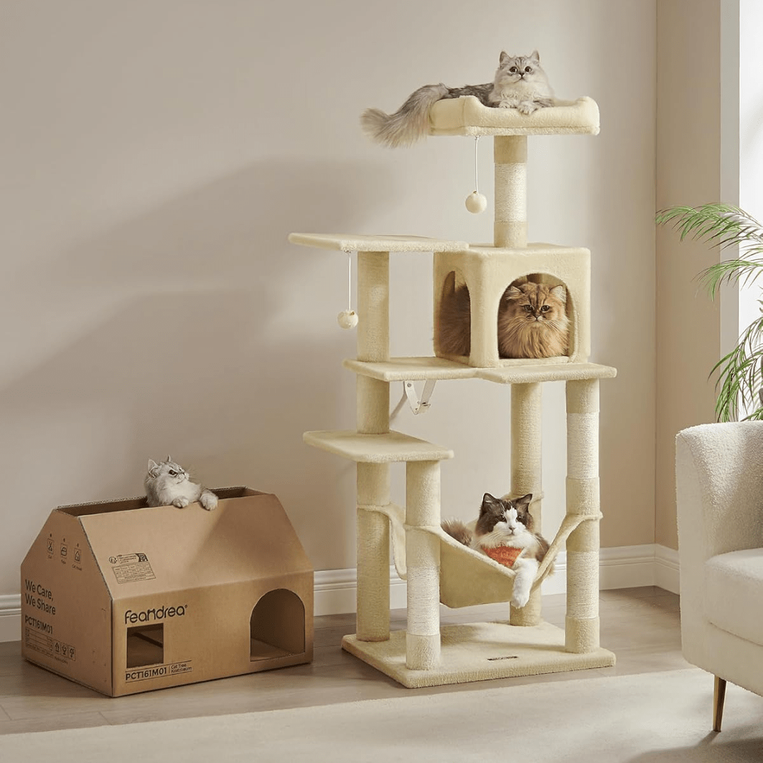 De krabpaal beige is een multifunctioneel kattenmeubel dat voorziet in alle natuurlijke behoeften van uw kat. Dit 143 cm hoge speelparadijs biedt vijf verschillende niveaus met een zachte hangmat, gezellig holletje en meerdere krabpalen bekleed met sisal. Perfect voor binnenkatten die behoefte hebben aan beweging, rust en entertainment. De beige krabpaal combineert functionaliteit met een neutrale kleur die in elk interieur past.